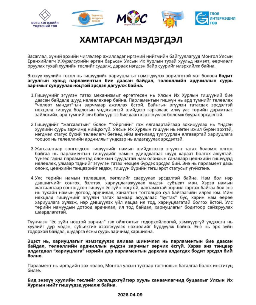 Засаглал, хүний эрхийн чиглэлээр ажилладаг иргэний нийгмийн байгууллагууд Монгол Улсын Ерөнхийлөгч У.Хүрэлсүхийн өргөн барьсан Улсын Их Хурлын тухай хуульд нэмэлт, өөрчлөлт оруулах тухай хуулийн төслийг судалж, дараах нэгдсэн байр суурийг илэрхийлж байна.